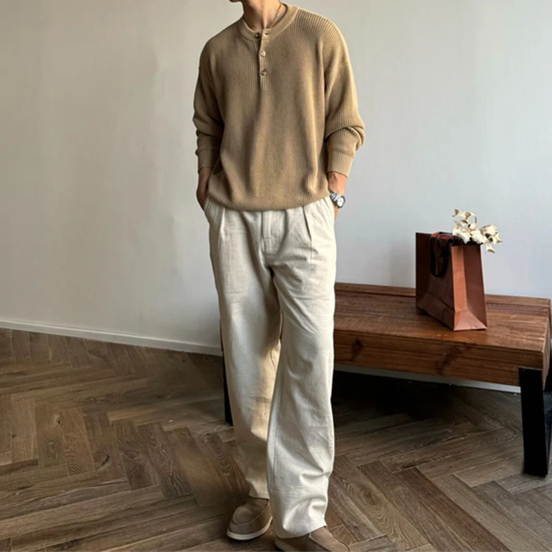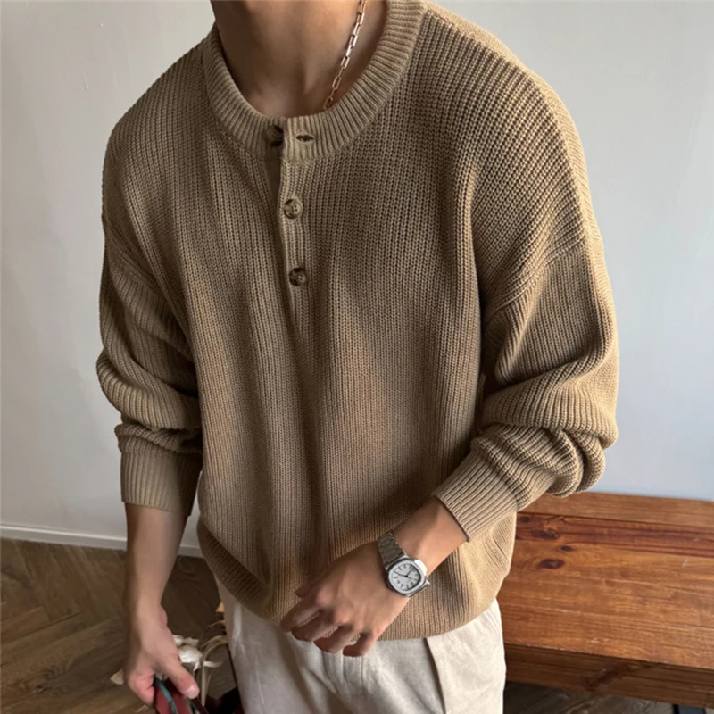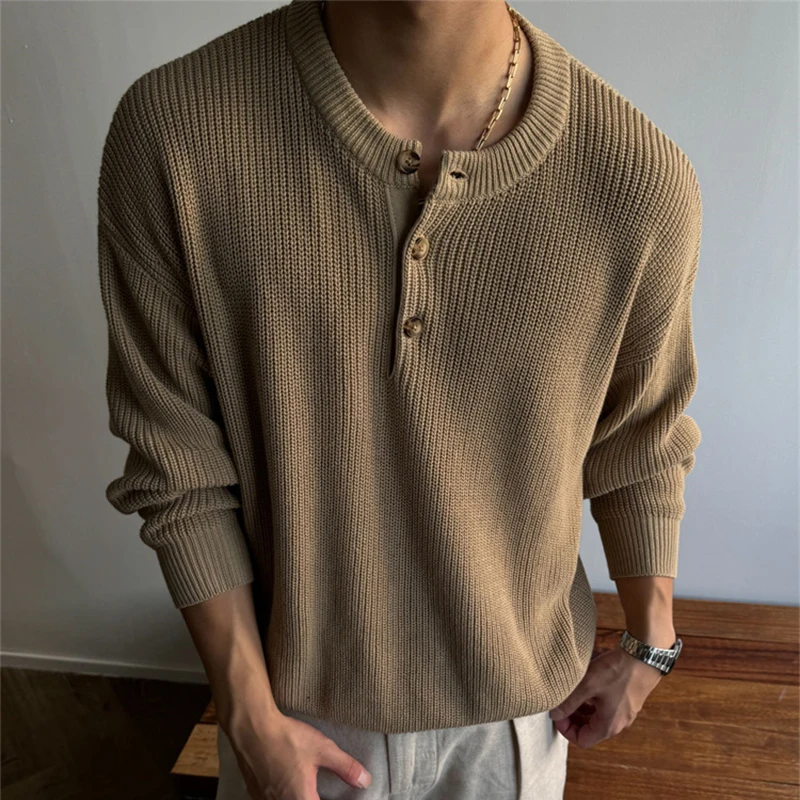 BONSIR - Streetwear Fashion Mens Sweaters Long Sleeve Buttoned Henley Collar Knit Tops For Men 2025 Spring Trendy Slim Knitted Pullovers