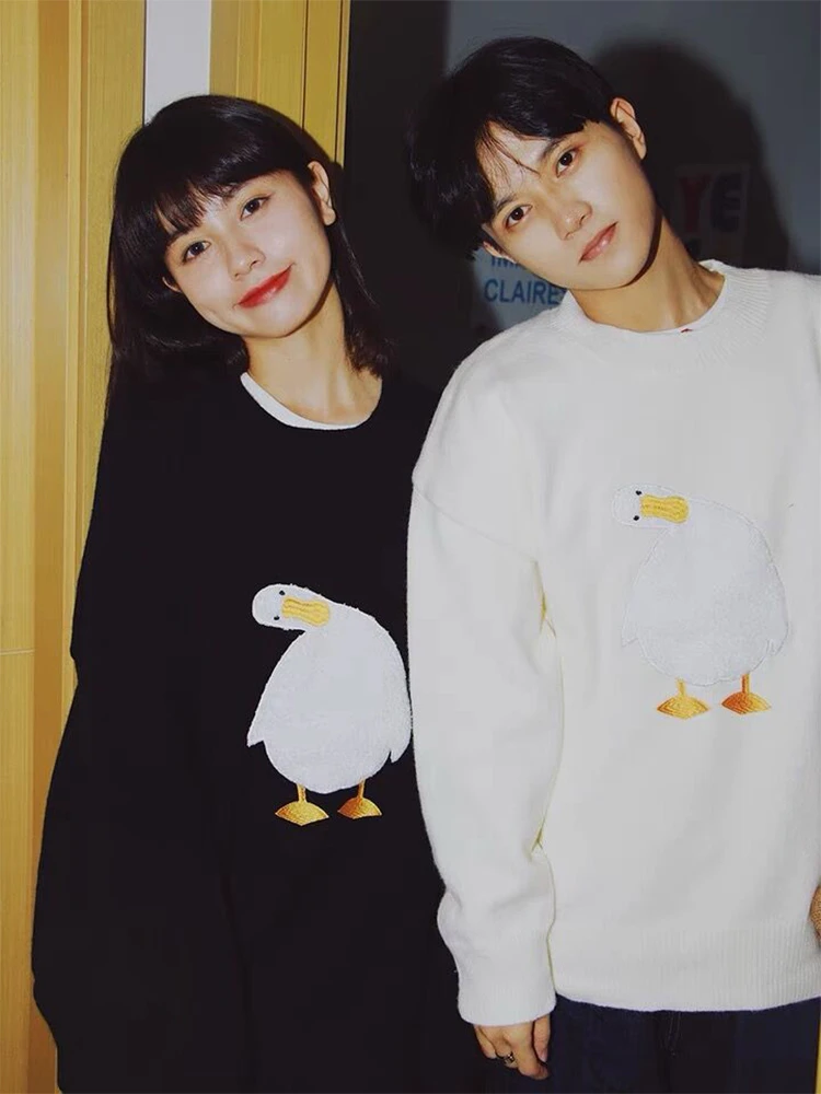 Bonsir Streetwear Harajuku Cartoon Duck Pattern Knitted Sweaters Loose Jumpers Fashion Casual Winter Sweater Pullover Men Women