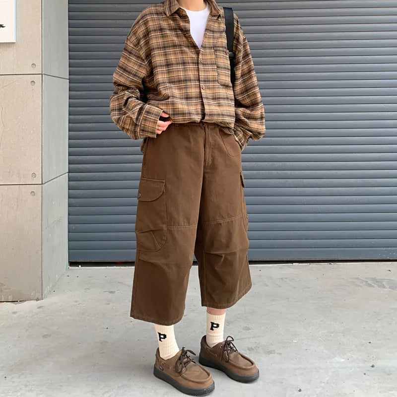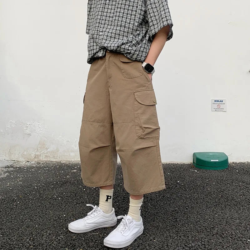 BONSIR - Summer Cotton Casual Pants Men Retro Cargo Pants Men Japanese Streetwear Hip-hop Loose Wide Leg Pants Men Cropped Trousers