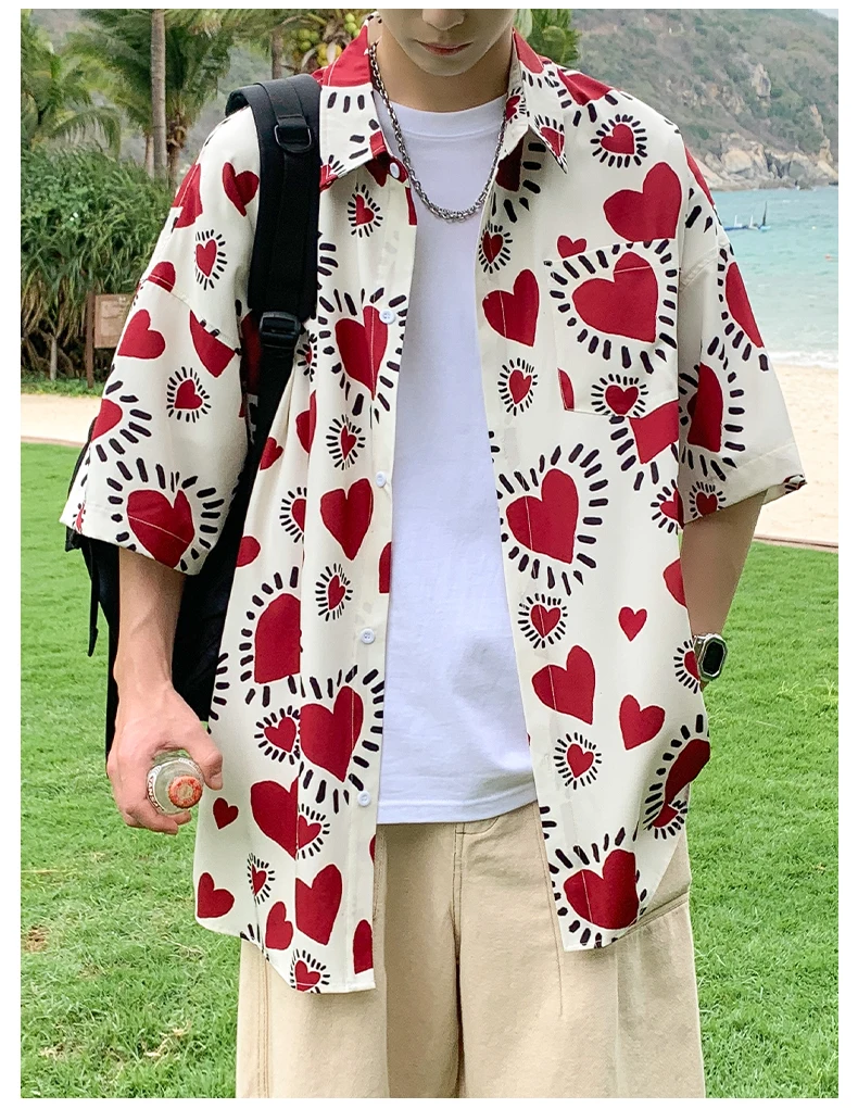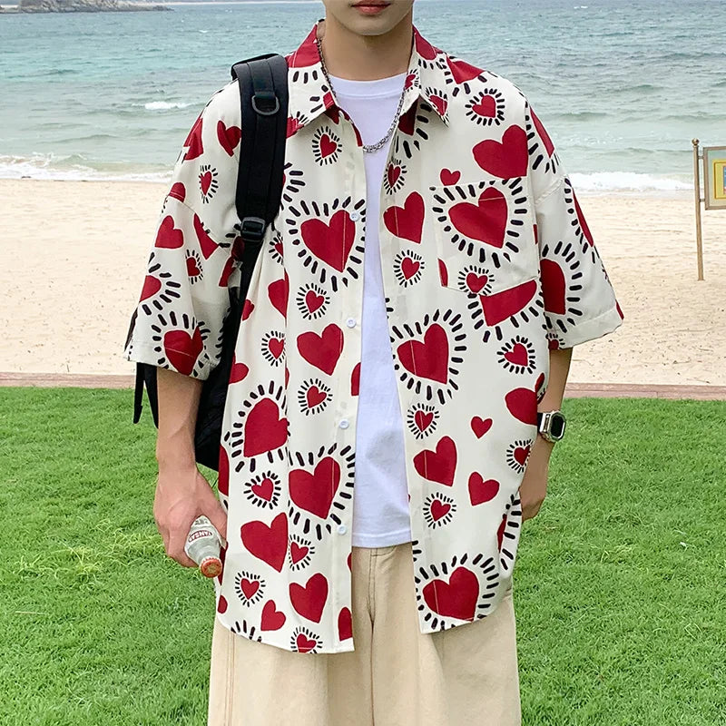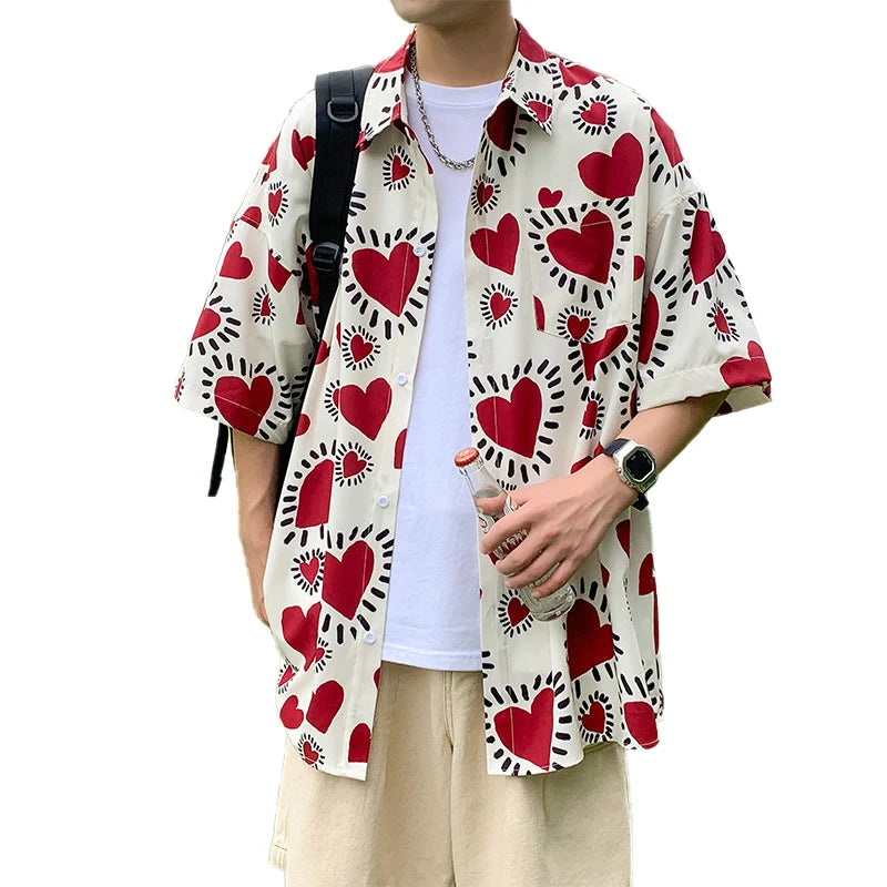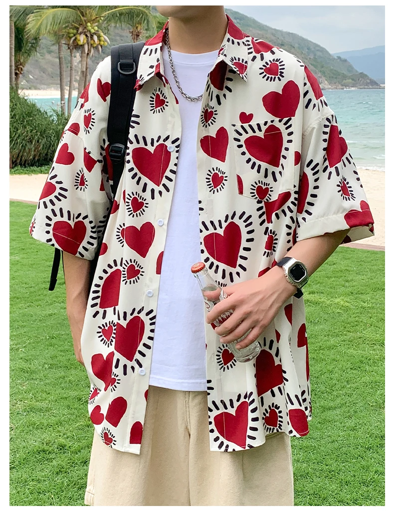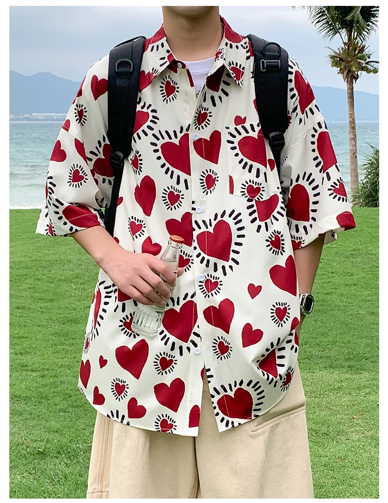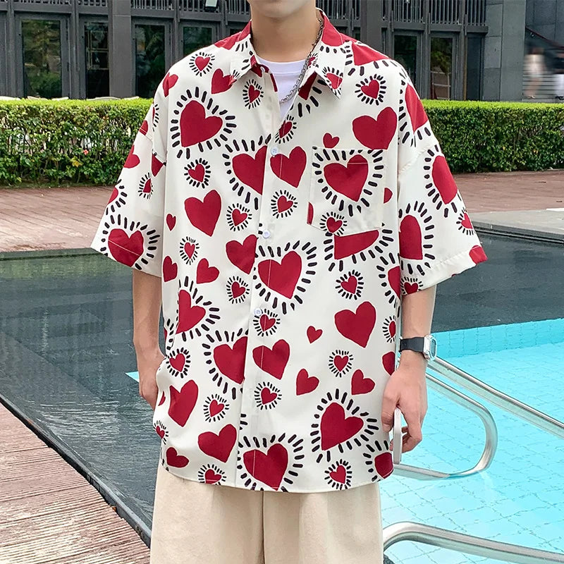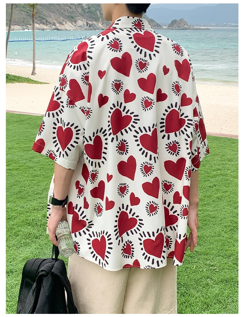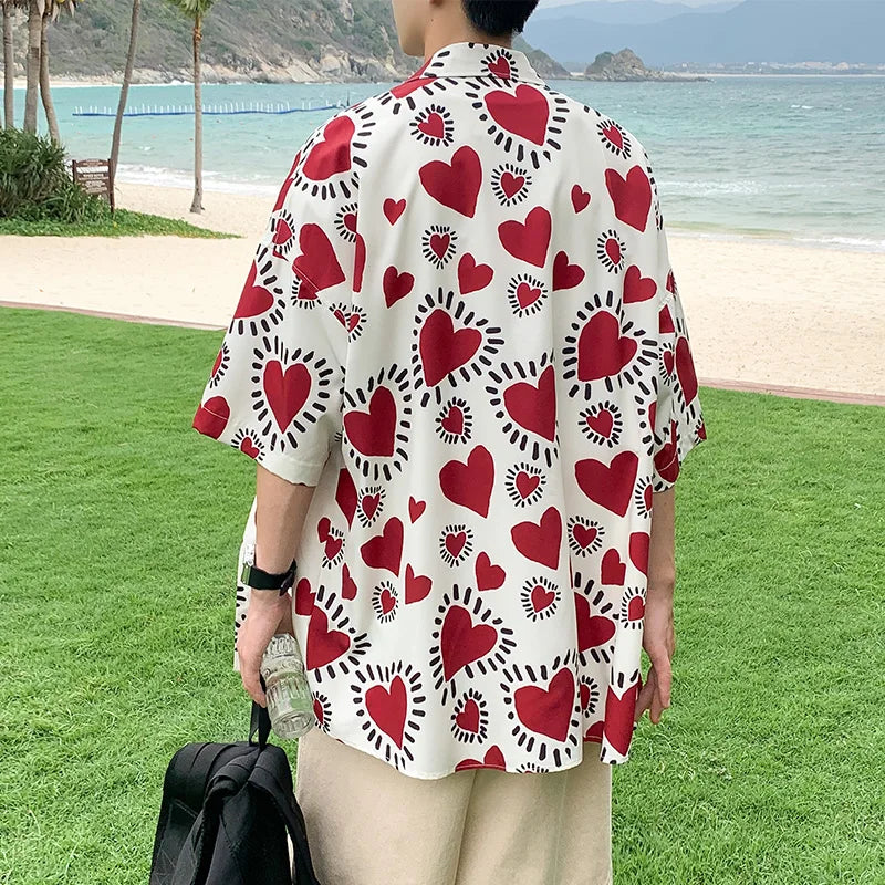 BONSIR - Summer Mens Heart Print Shirts Streetwear Oversized Hawaiian Shirt Harajuku Hip Hop Trend Fashion Women Large Size Casual Tops