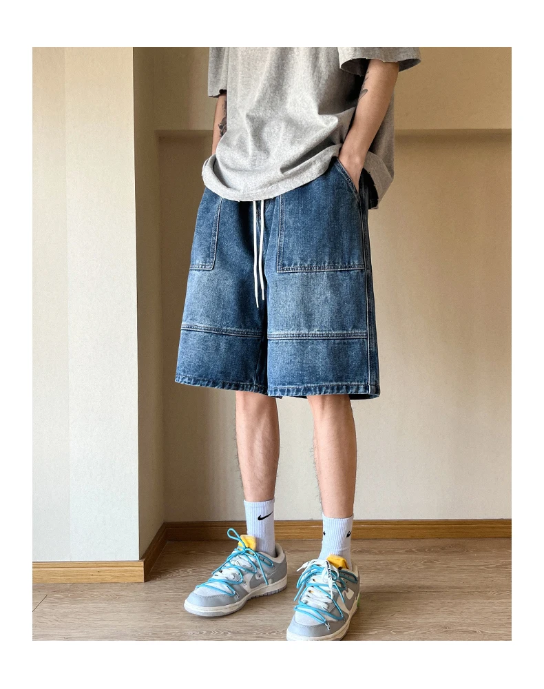 Bonsir Summer New High Street Casual Versatile Denim Capris Elastic Waist Men's Korean Style Loose Wide Leg Large Pocket Shorts