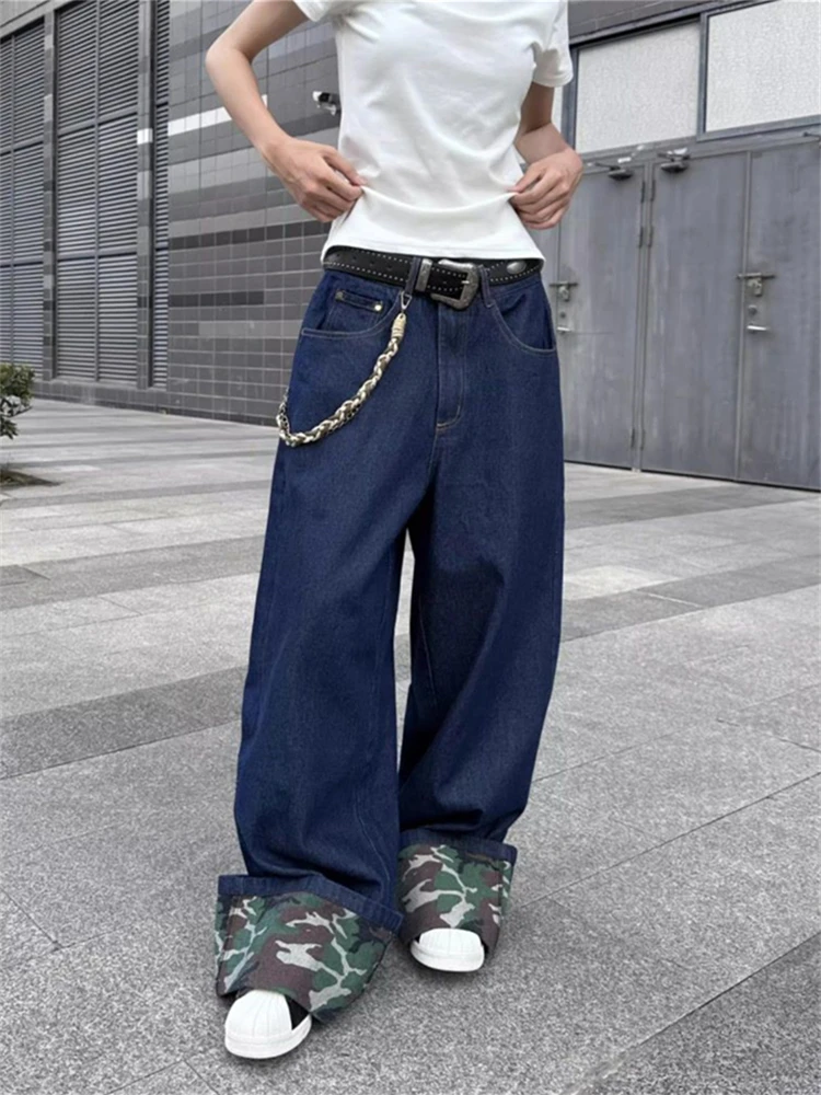 BONSIR - Women's Spliced Camouflage Flanged Jeans Street Girl Bottoms Wide Legs Pants Female Fashion High Waist Blue Denim Trousers