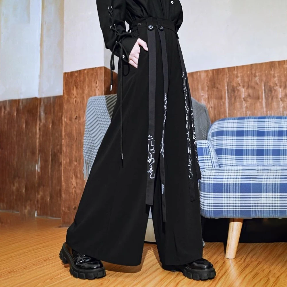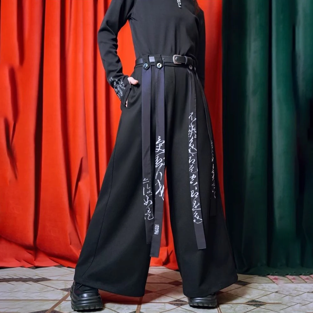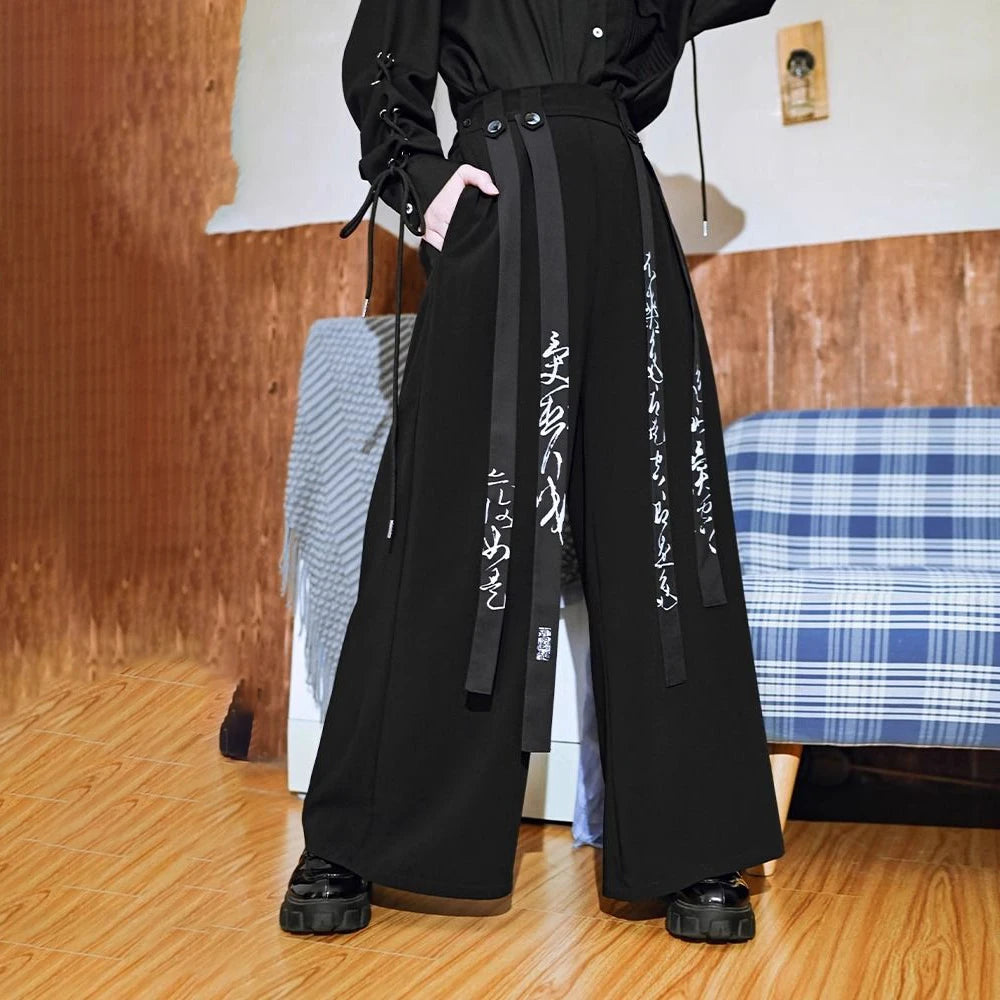 Bonsir Y2k Calligraphy Ribbon Skirt Pants Gothic Dark Style Hakama Genderless Japanese Streetwear Casual Wide-Leg Samurai Pants Unisex