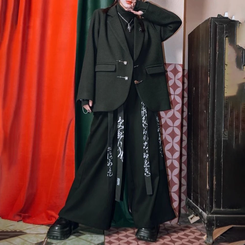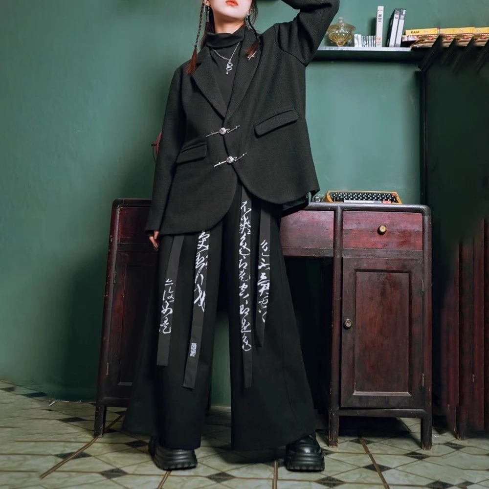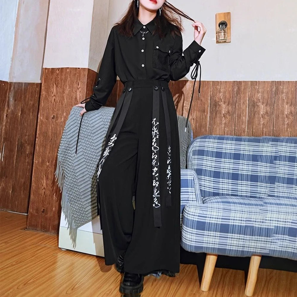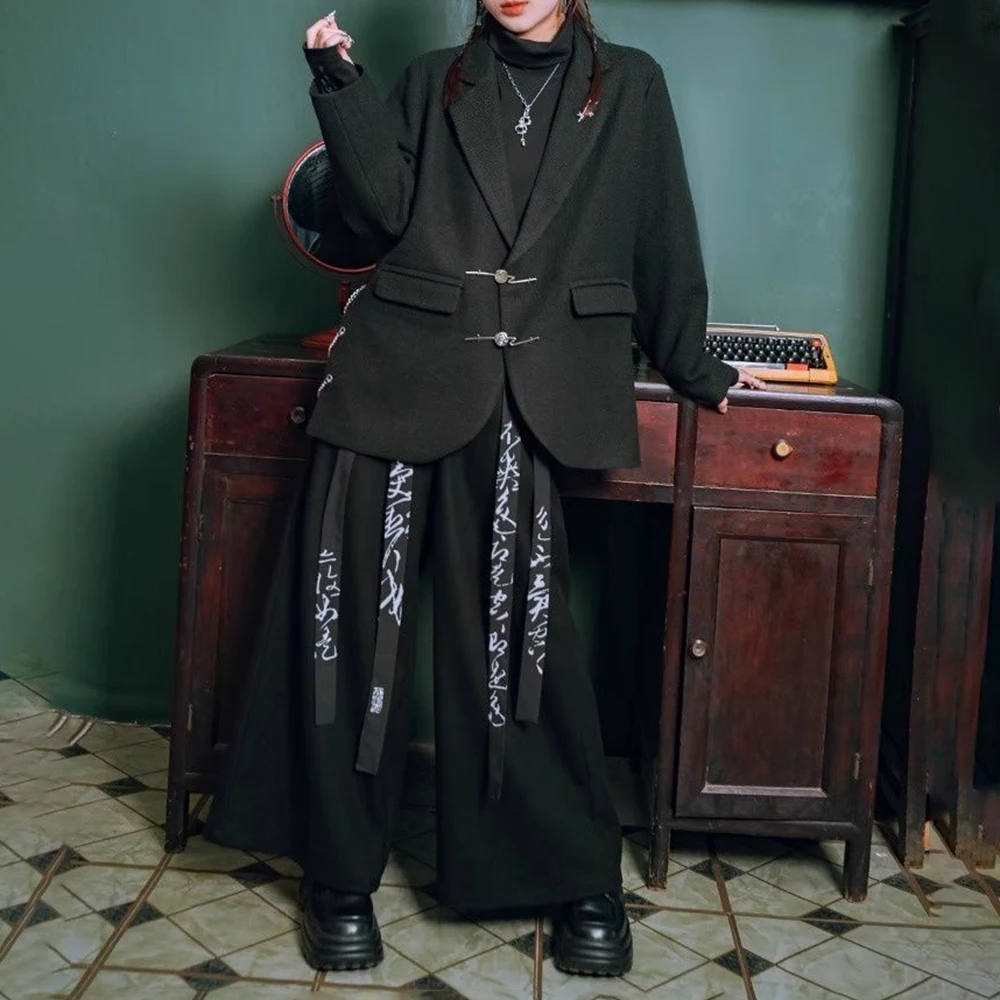 Bonsir Y2k Calligraphy Ribbon Skirt Pants Gothic Dark Style Hakama Genderless Japanese Streetwear Casual Wide-Leg Samurai Pants Unisex