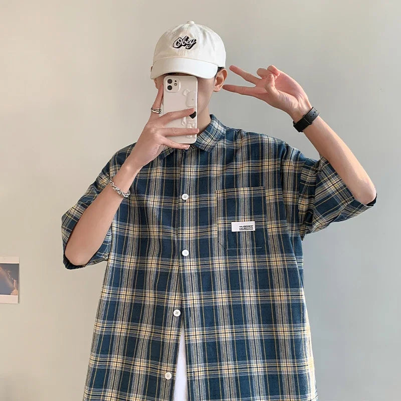 BONSIR - Y2k Streetwear Plaid Men Shirts Summer Fashion Chemise Homme Fashion Mens Checkered Shirts Short Sleeve Men Blouse