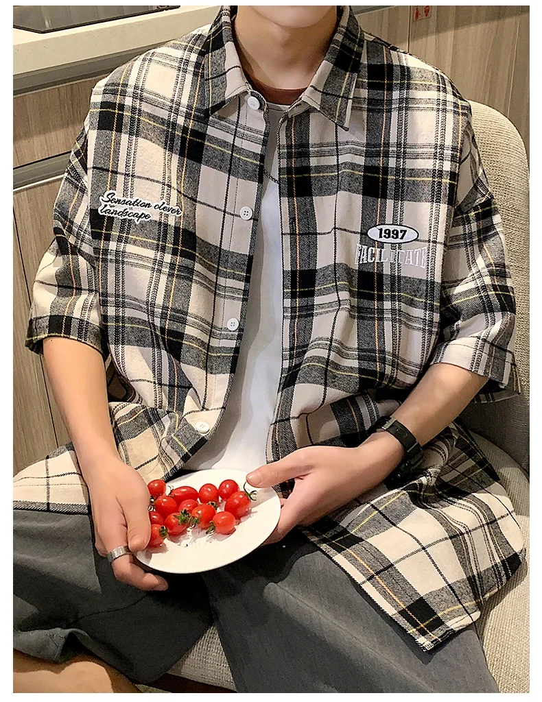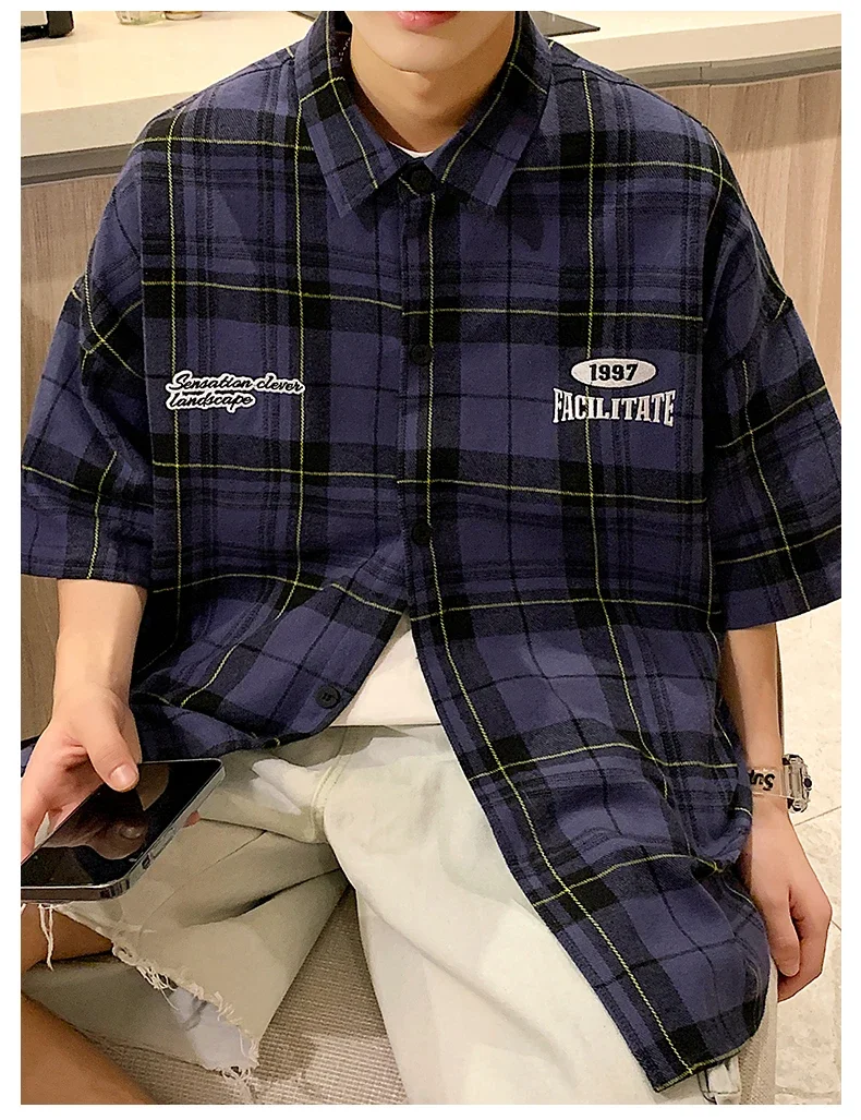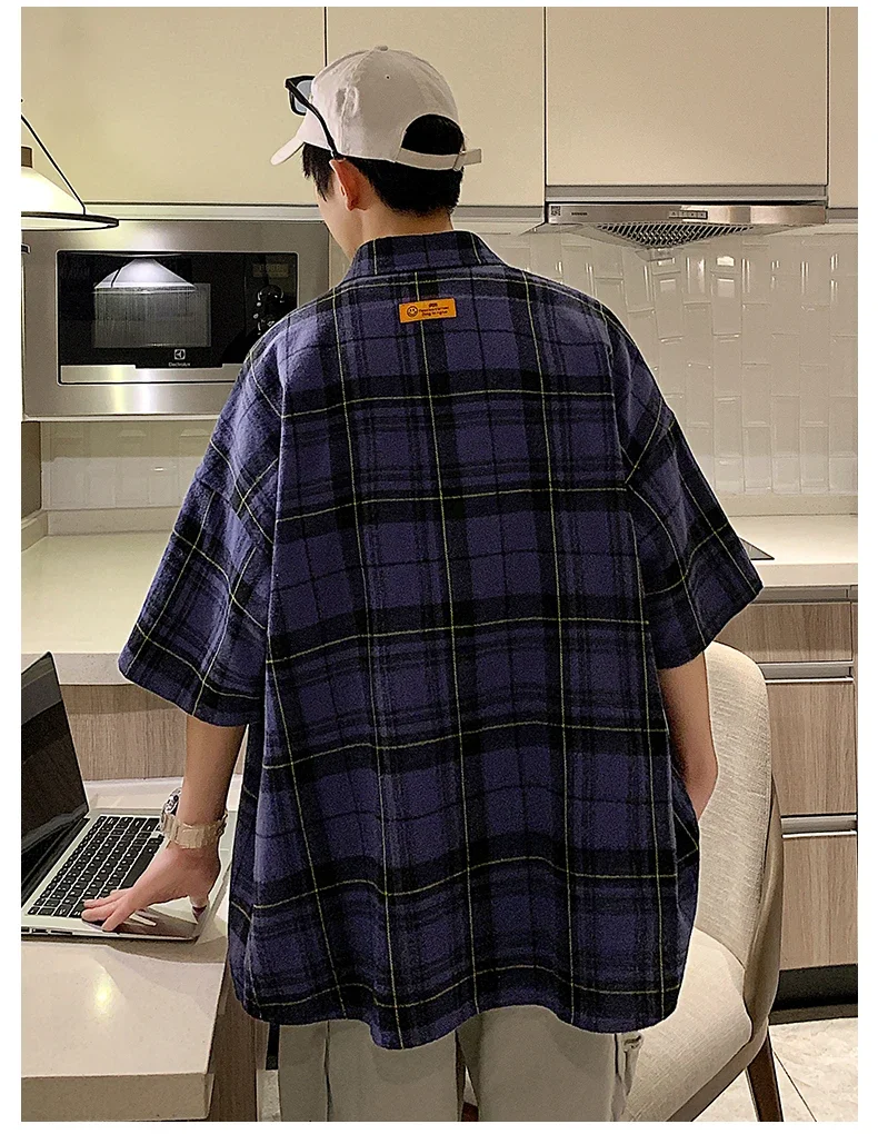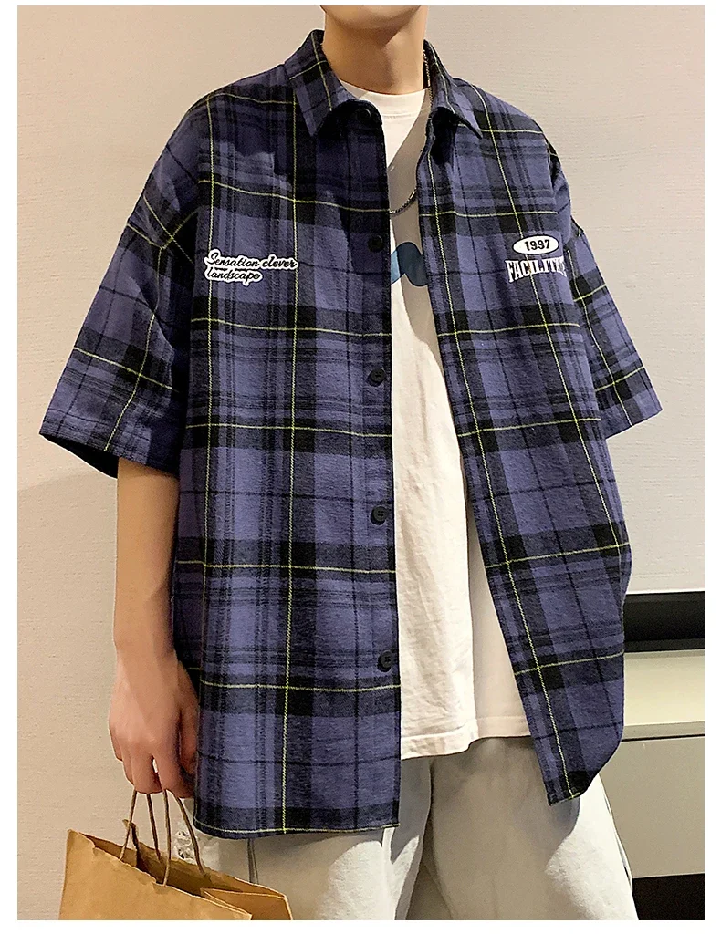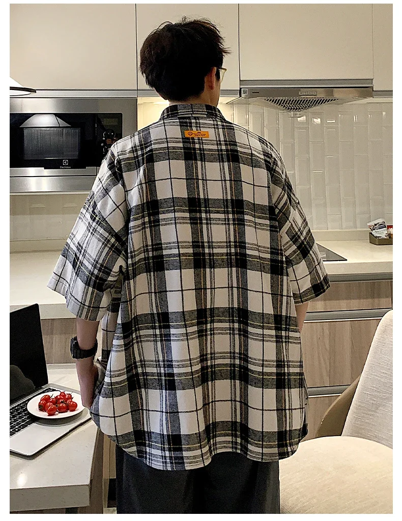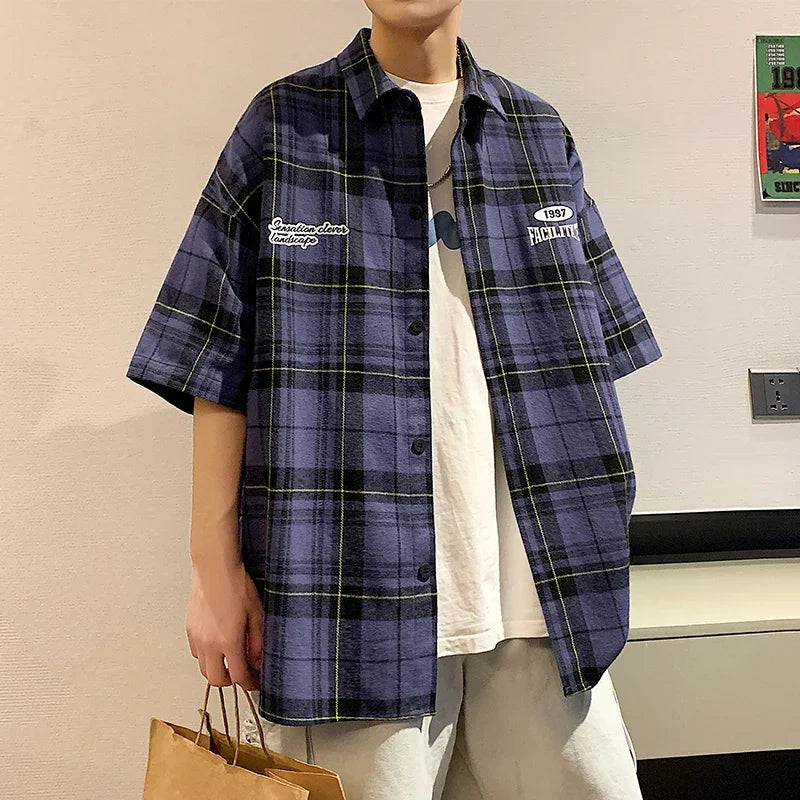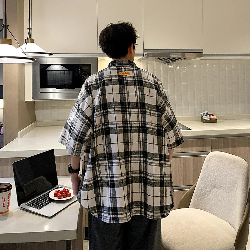 BONSIR - Y2k Streetwear Striped Plaid Shirt Men Single-breasted Square Collar Shirts Summer Fashion Casual Camisa Men Chemise Tshirt