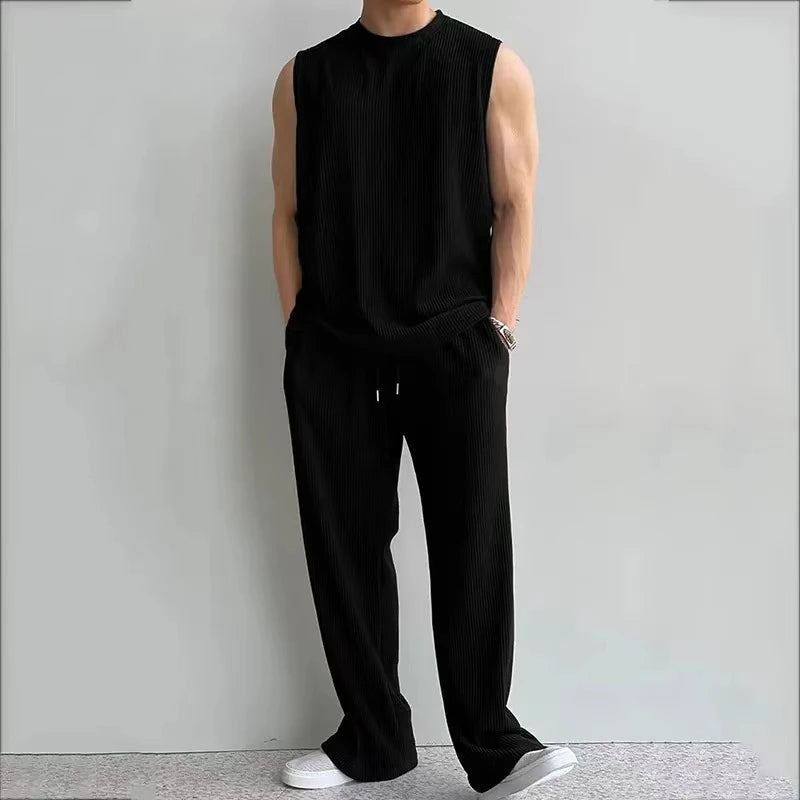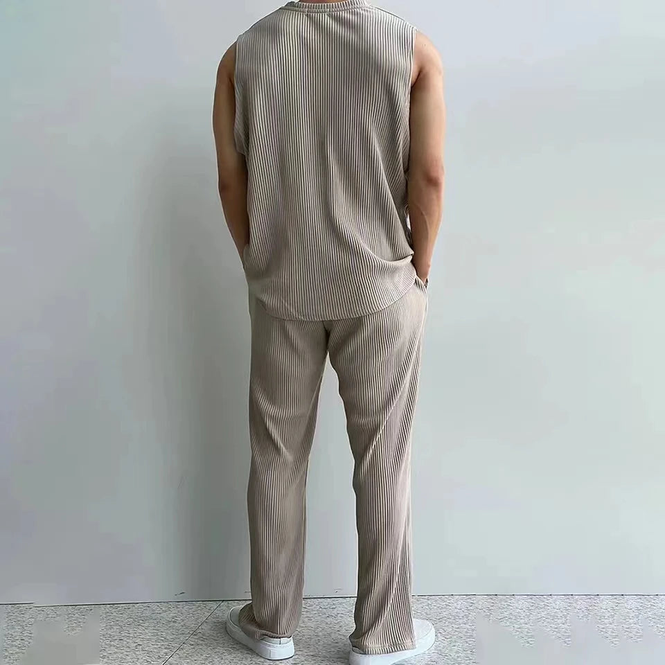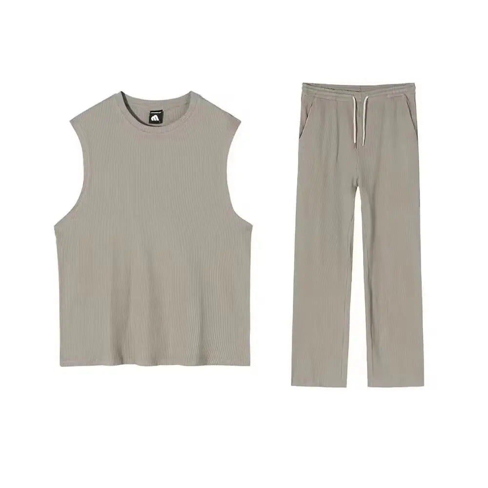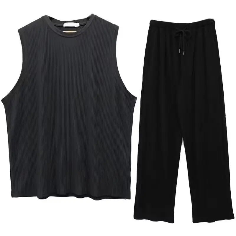 BONSIR - Fashion Solid Two Piece Suits Men‘s O-Neck Sleeveless Tops And Pants Outfits Men Summer New Casual Simplicity Solid Rib Sets
