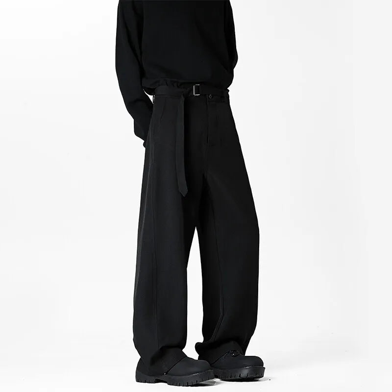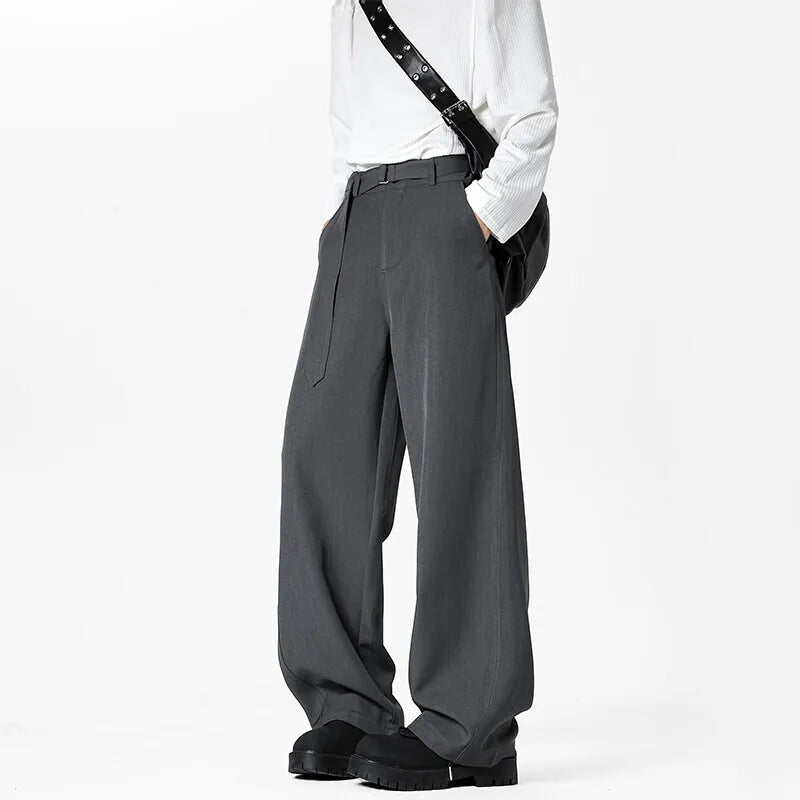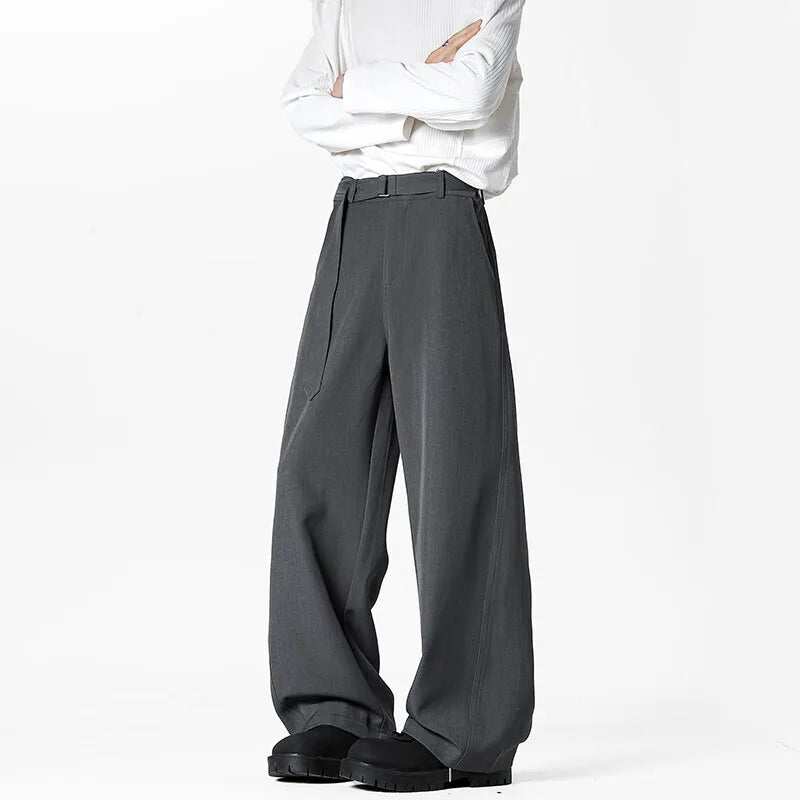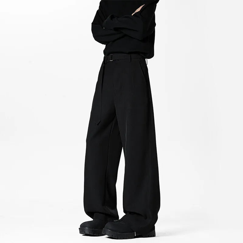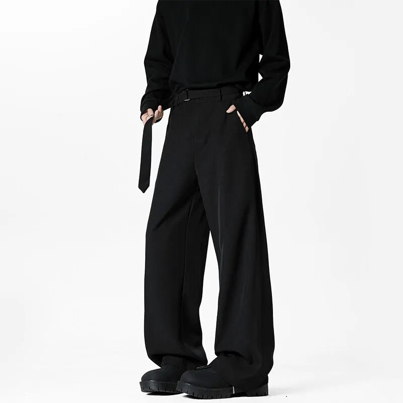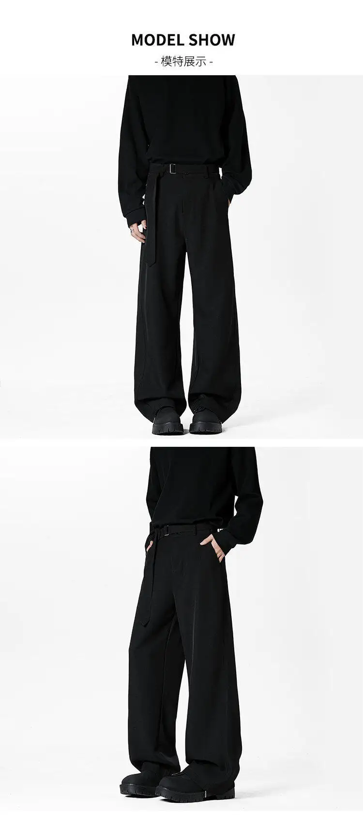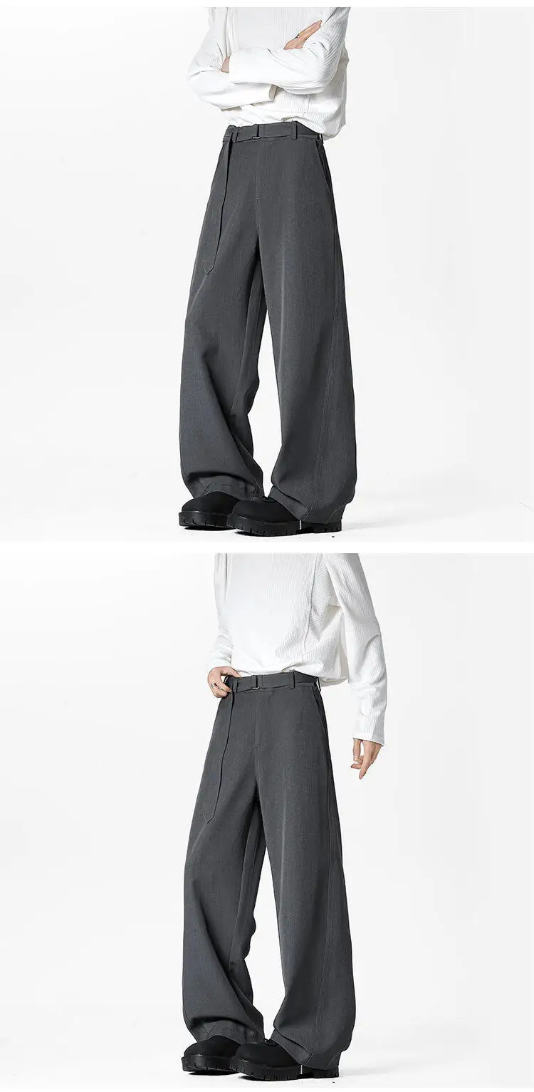 BONSIR - Grey Belt Suit Pants Men Fashion Society Mens Black Dress Pants Korean Loose Wide Leg Pants Mens Office Formal Trousers M-3XL