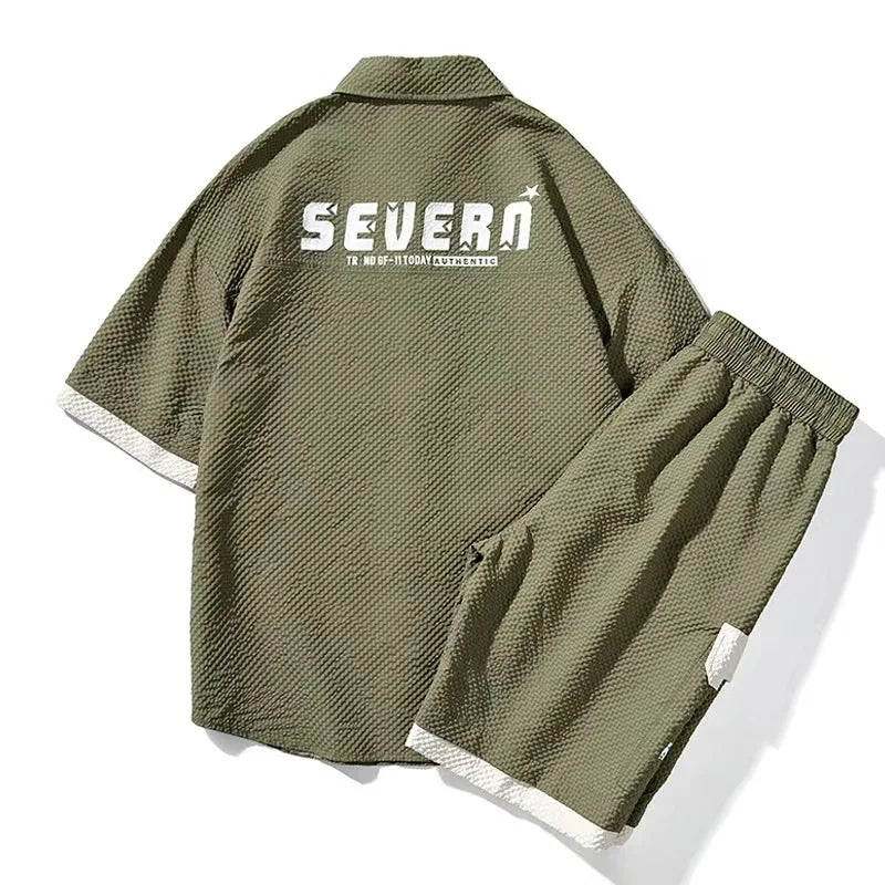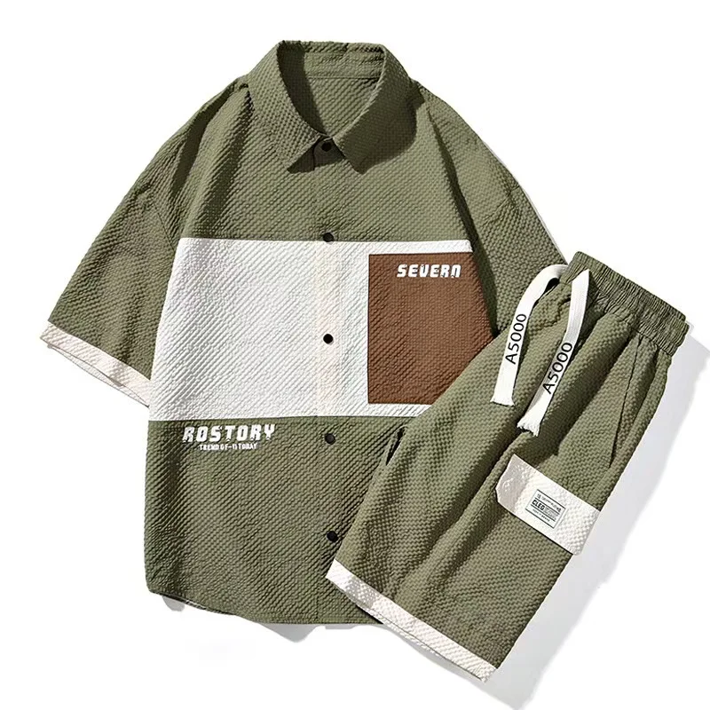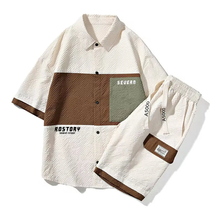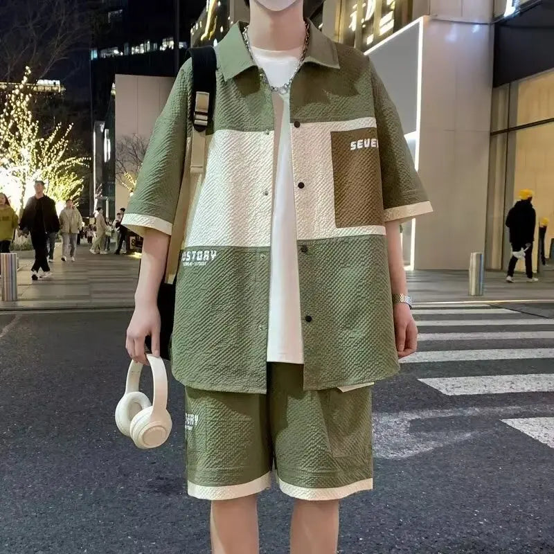 BONSIR - Men's Summer Trendy Brand Short Sleeve Shirt Snd Shorts Two piece Set Ice Silk Splicing Letter Pattern Printed Men's Casual Set