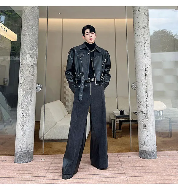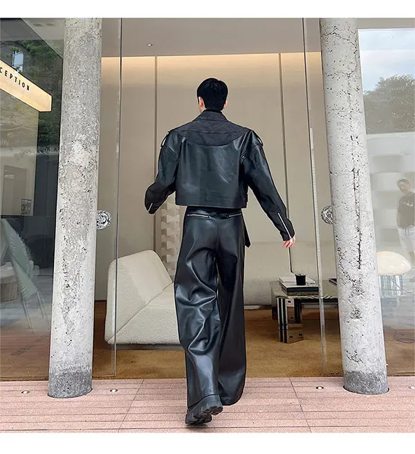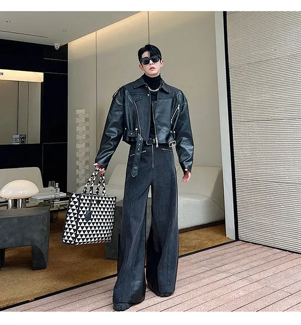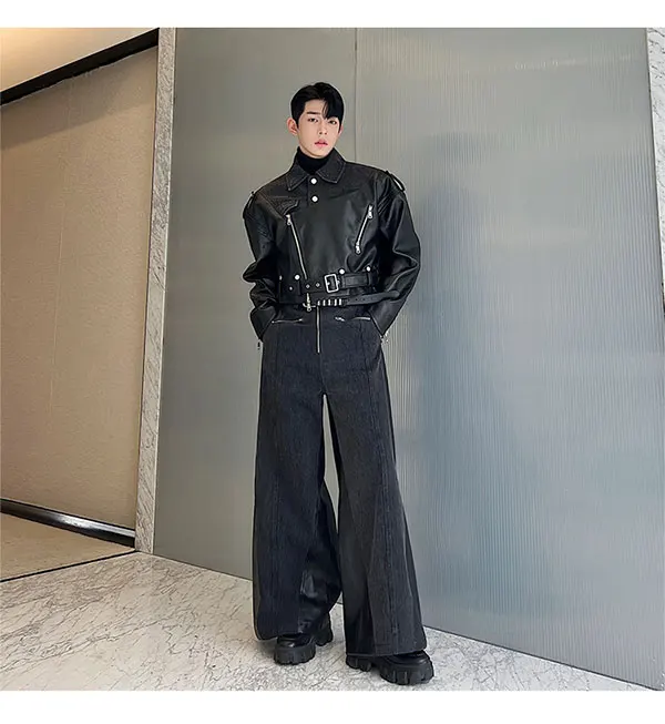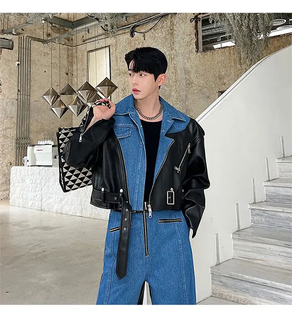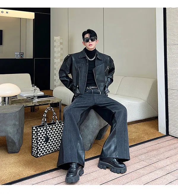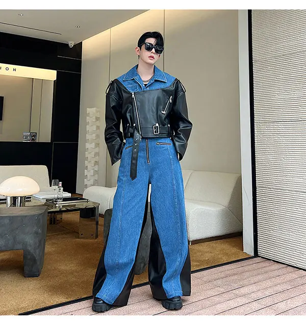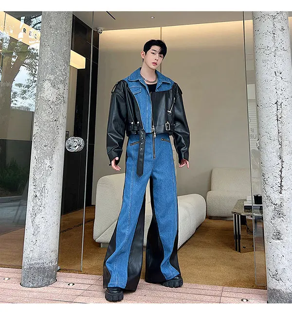 Bonsir New Fashion Men's Set Niche Design Two-piece Patchwork Suit Denim Leather Spliced Short Jacket Straigt Pants