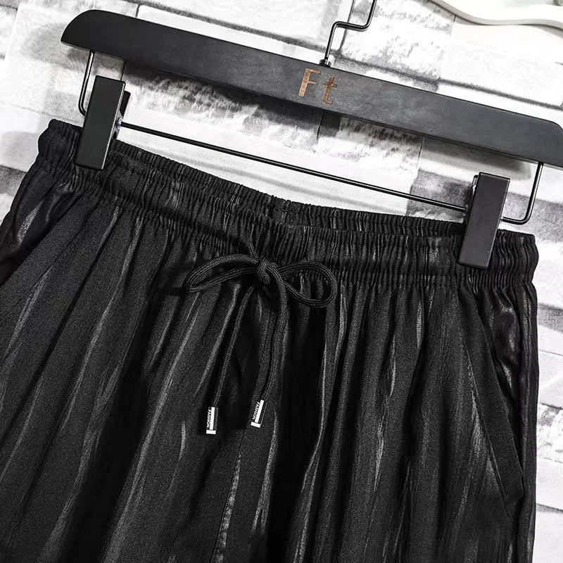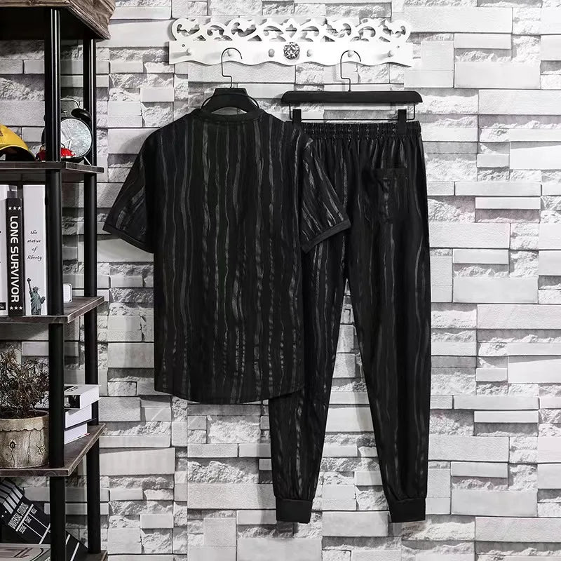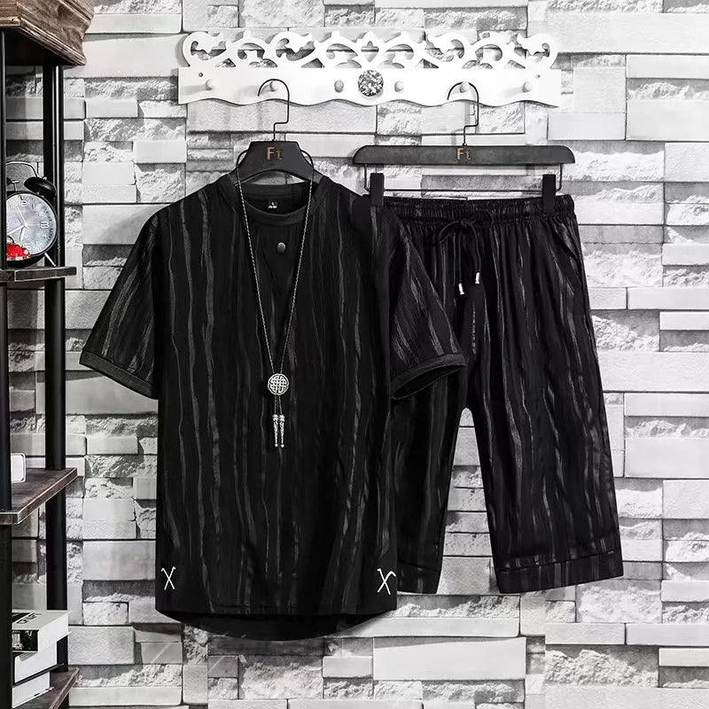 BONSIR - Summer New Loose Two Piece Set Men's Short-sleeved T-shirt Drawstring Pants Korean Wrinkle Sports Casual Suit Trend Men Clothes