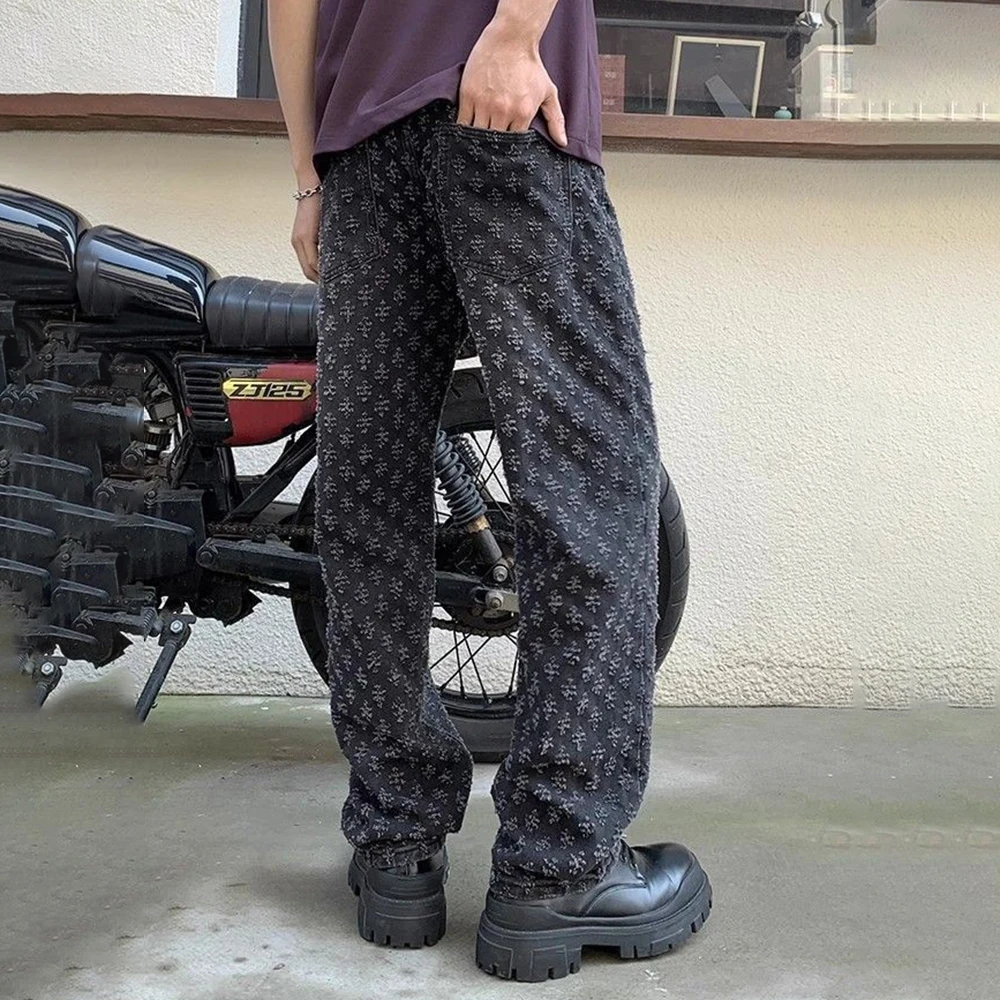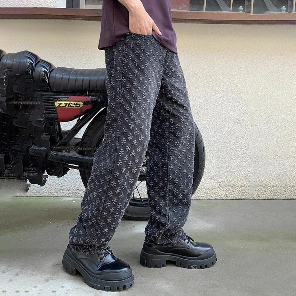 BONSIR - Summer New Fashion Jacquard High Street Trend Y2k Design Baggy Jeans Men Straight Washed Wide Leg Casual Trousers Mens Wear